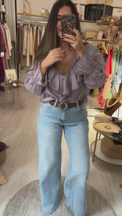 Blusa tejido tencel suave con escote de pico y volante decorativo con ,puño engomado y con volante ,talla única recomendable hasta una talla 42