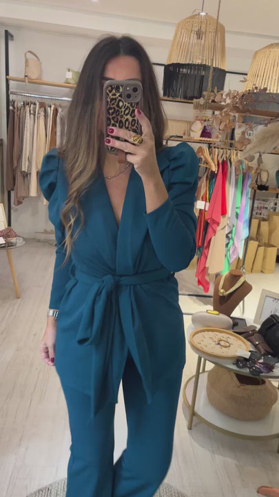 Conjunto chaqueta cruzada con fajín y manga larga abullonada, pantalón con goma tipo leggins y bajo campana.