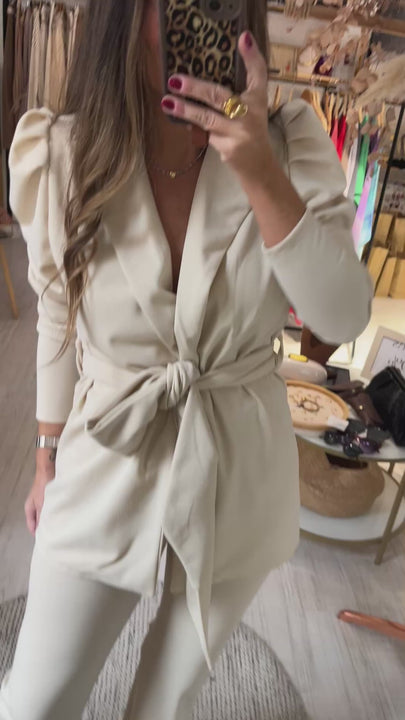 Conjunto chaqueta cruzada con fajín y manga larga abullonada, pantalón con goma tipo leggins y bajo campana.