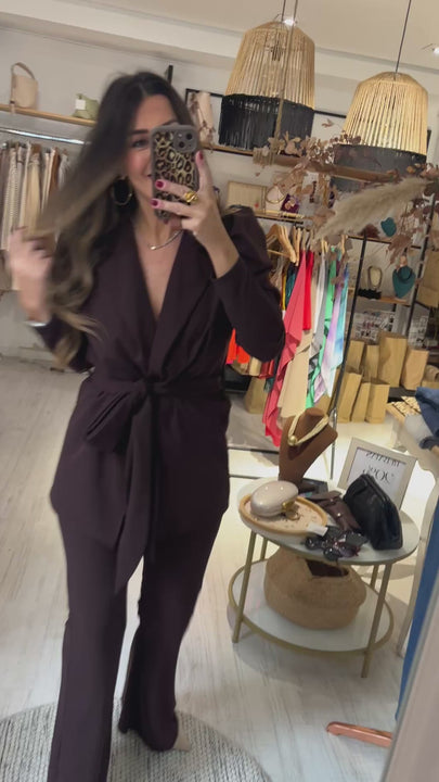 Conjunto chaqueta cruzada con fajín y manga larga abullonada, pantalón con goma tipo leggins y bajo campana.