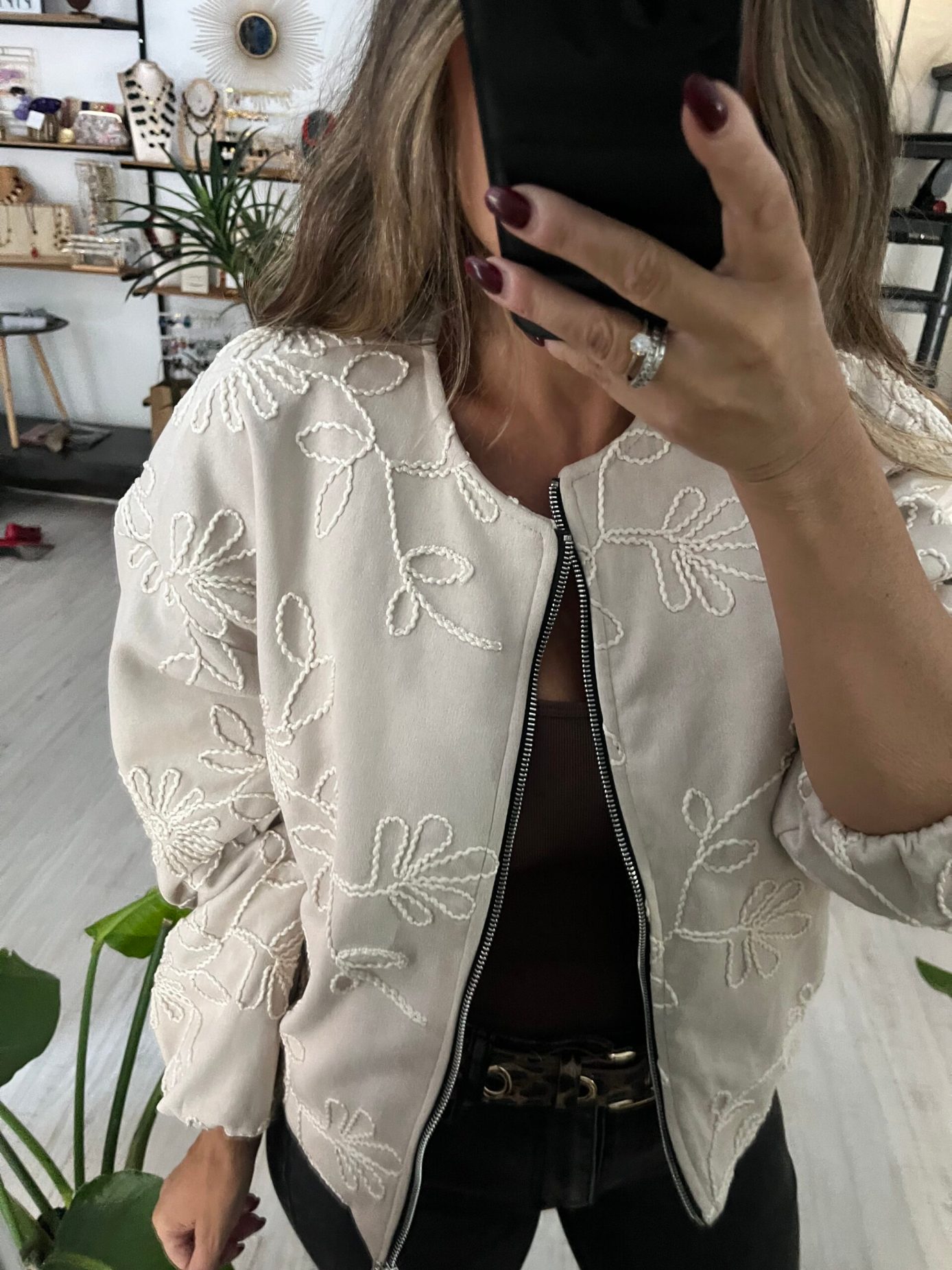 Bomber tejido antelina suave bordado , con cremallera y forro, lleva bolsillos, goma en puños.